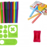 - 12 feutres de couleur, 12 craies de couleur, pochoir avec formes géométriques, pochoir avec lettres, feutre lumineux, crochet pour papier, tiroirs de rangement
