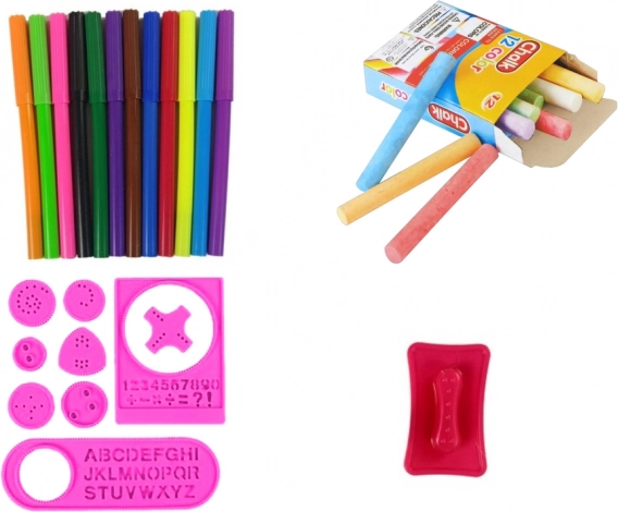 - Tableau, 12 feutres, 12 craies, pochoir de formes, pochoir de lettres, feutre lumineux