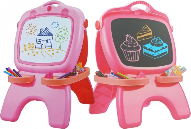Le tableau propose deux faces : une face blanche magnétique pour feutres effaçables et une face noire à craie. Le tiroir pratique garde tous les accessoires à portée de main, tandis que le crochet pour papier permet de fixer une feuille et de peindre comme sur un chevalet. Dimensions stables 64 × 44 × 30 cm et hauteur de surface 30 cm, adaptées aux enfants dès 3 ans.