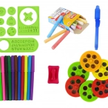 Un riche ensemble d’accessoires est inclus : 36 pochoirs d’images, 6 disques à motifs, 12 feutres de couleur, 12 craies de couleur, des pochoirs de formes géométriques et de lettres, ainsi qu’un feutre spécial avec lumière UV qui révèle ce que l’enfant a dessiné lorsqu’on l’éclaire. Les compartiments pratiques gardent tout à portée de main et facilitent le rangement.