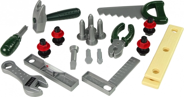 Scie, marteau, tournevis, clé, pince multiprise, vis, écrous et plaquettes – tout ce dont un petit bricoleur a besoin pour exercer sa motricité fine et son imagination.