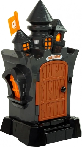 Des lumières orange scintillent aux fenêtres pendant qu’on entend le tic-tac, des grincements et le rire de la sorcière – idéal pour une ambiance d’Halloween authentique.