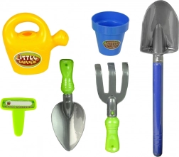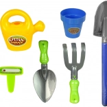 - Le set comprend un seau, un pot de fleurs, une pelle, un arrosoir, un râteau et une bêche.