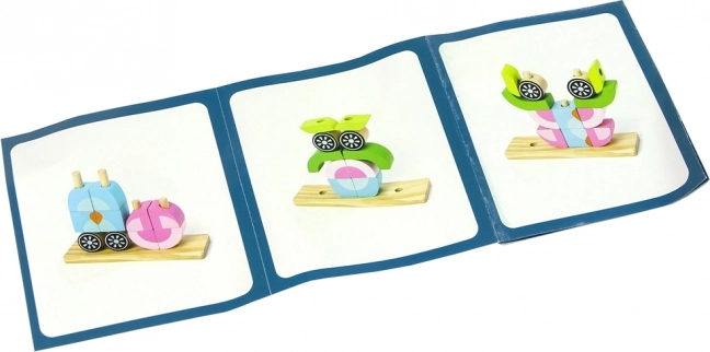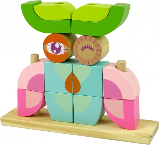 Ce set comprend une base en bois et 12 blocs, qui peuvent être assemblés en différentes formes, comme des animaux ou des objets. L’enfant peut enfiler les blocs sur les tiges de la base dans diverses configurations, ce qui développe sa créativité.