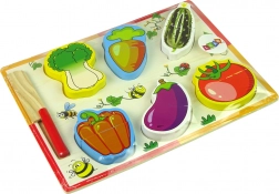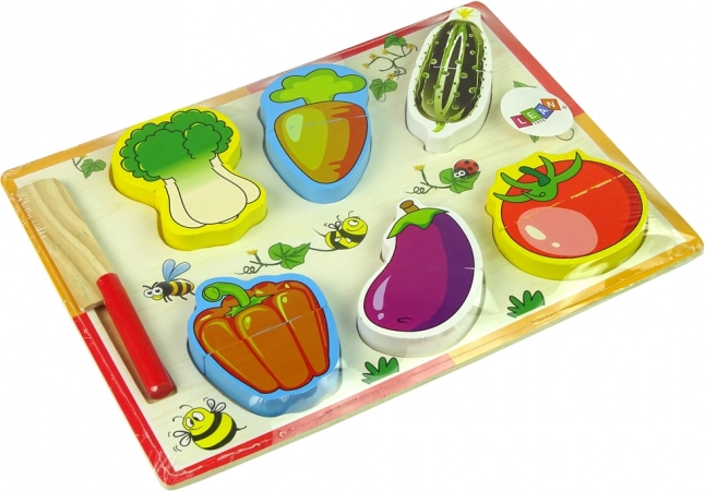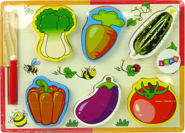 - Contenu du set : aubergine, carotte, tomate, chou, concombre, poivron, couteau en bois, planche à découper