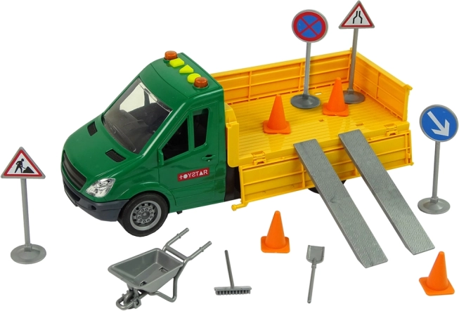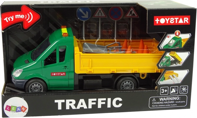 La boîte contient également des panneaux de signalisation, des plots, une brouette, une pelle et d’autres accessoires permettant aux enfants de délimiter facilement un chantier et d’apprendre à reconnaître les symboles routiers. Le jeu devient encore plus amusant grâce aux sons de marche arrière, signaux d’alerte et effets de chargement. Des matériaux de qualité garantissent une longue durée de vie et un amusement en toute sécurité.