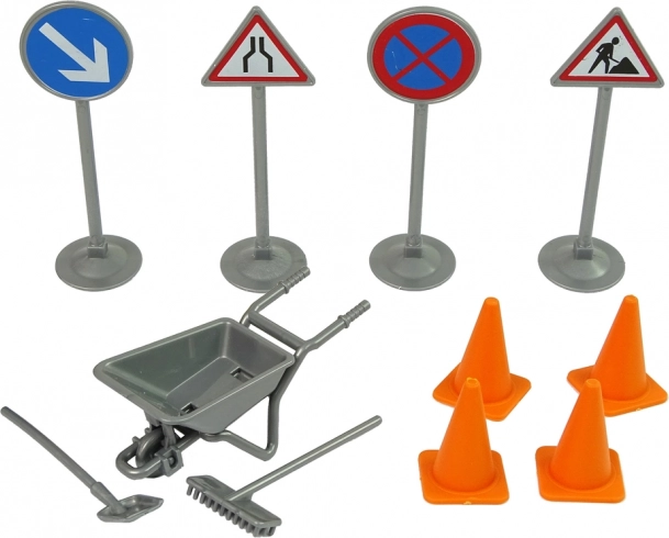 Plots, panneaux, brouette, pelle et autres outils créent un chantier réaliste. Les enfants apprennent les panneaux et les règles de circulation en s’amusant.