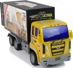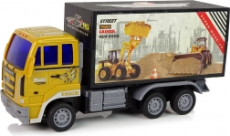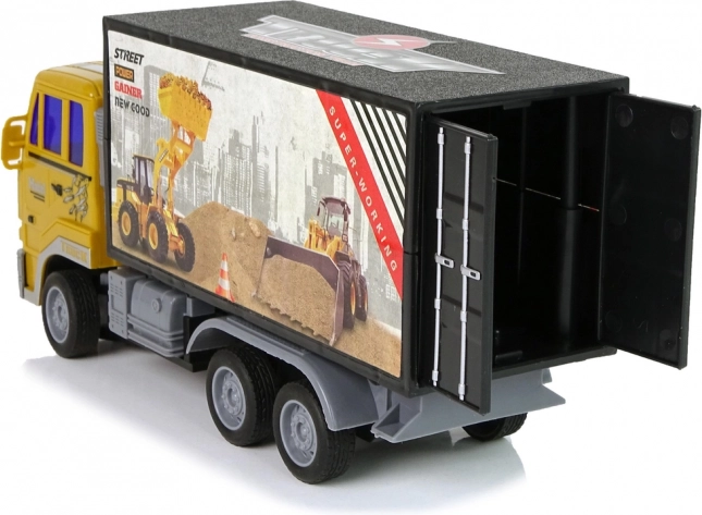 Le camion possède une cabine jaune et un conteneur noir avec des autocollants voyants, reproduisant fidèlement une véritable machine de chantier.