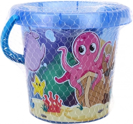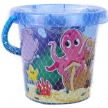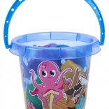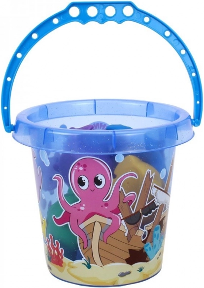 Un seau avec poignée bleue et motifs du monde marin, idéal pour transporter et ranger les jouets.