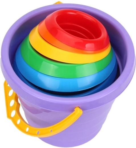 Ce jouet, qui exerce la créativité et la pensée logique, n’a pas de règles de jeu fixes – sa manière d’être utilisé dépend de l’enfant, de ses parents et de leur imagination. Nous sommes certains que ses couleurs vives et féeriques ainsi que sa finition de qualité encourageront chaque petit à apprendre en jouant. L’un des éléments est un seau avec poignée, dans lequel on peut ranger toutes les pièces.