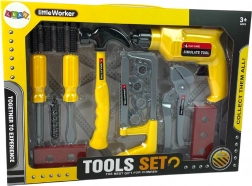 Le set contient tout le nécessaire pour visser, percer et « scier » – de la perceuse et la scie au marteau, à la pince et à divers types de vis avec rondelles et écrous. La couleur jaune attire l’attention et stimule la perception visuelle, tandis que le jeu de rôle développe la motricité fine, la coordination œil-main et la créativité.