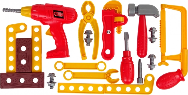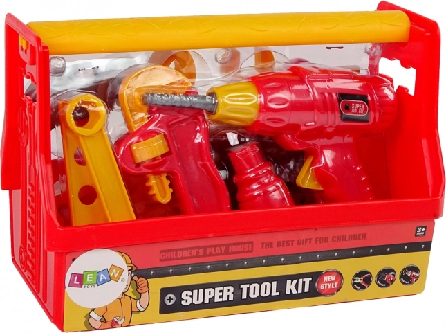 Ensemble complet pour petits bricoleurs dans une mallette pratique. Comprend une perceuse adaptée aux petites mains, un tournevis, un marteau, une pince, une clé à molette, un étau et des éléments de fixation. Matière plastique légère, couleur rouge vive et possibilité de tout ranger dans une boîte de transport pour favoriser le développement de la motricité et le jeu créatif. Convient dès 3 ans, avec certification CE.