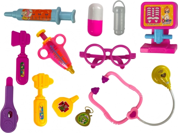 - Contenu du set : 2x seringue, marteau de chirurgien, radiographie, thermomètre, grande boîte en forme de comprimé, petites boîtes pour « médicaments », stéthoscope avec cœur, lunettes, petit couteau, miroir.