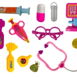 2× seringue, marteau de chirurgien, radiographie, thermomètre, grande boîte en forme de comprimé, petites boîtes pour « médicaments », stéthoscope avec cœur, lunettes, petit couteau, miroir
