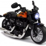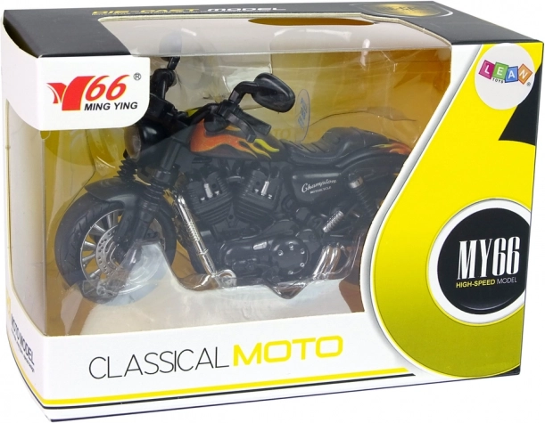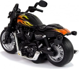 Le corps noir de la moto avec des flammes orange et des détails soignés offre l’aspect authentique d’une véritable motocyclette.