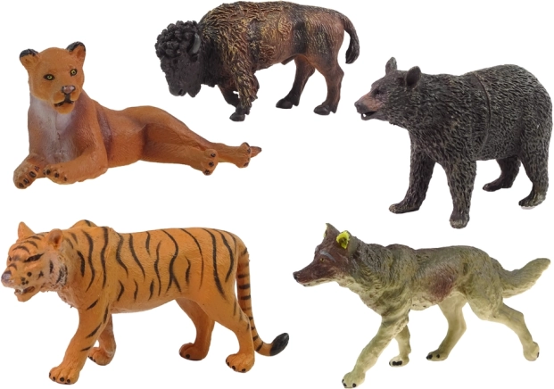 Le set comprend 6 figurines : ours, loup, jaguar, tigre, bison, lionne. Hauteur des figurines : 10 cm x 6 cm x 4 cm. Dimensions de la boîte : 45 cm x 27 cm x 7 cm.