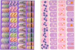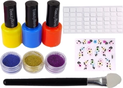 Décorez vos ongles à l’aide de divers autocollants à motifs et de paillettes en poudre dans trois couleurs éclatantes.