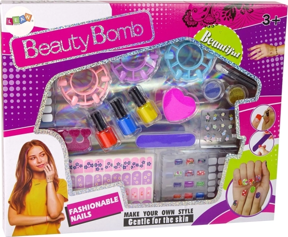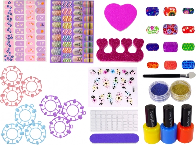 Ce coffret comprend plusieurs vernis à ongles colorés et divers autocollants colorés. Classiques, à motifs et pailletés, ils permettent de joliment vernir les ongles et de les retirer rapidement et facilement avec un dissolvant classique.