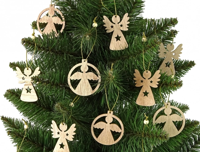 Élégant set de 12 petits anges en bois pour décorer le sapin de Noël. Aspect naturel, finitions délicates et ficelle pour suspendre qui raviront les amateurs de Noël traditionnel. Les décorations sont légères et résistantes, adaptées aussi aux foyers avec des enfants (à partir de 3 ans).