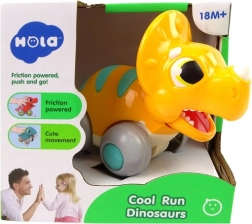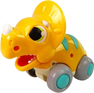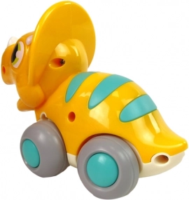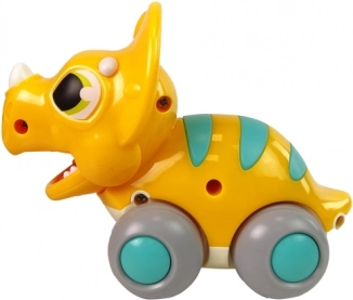 Ce triceratops coloré se distingue par son design joyeux avec un corps jaune et des rayures turquoise. Le mécanisme à retour permet un déplacement facile sur les surfaces planes : l’enfant presse le jouet contre le sol, le relâche et le dinosaure démarre, tout en ouvrant et fermant sa petite gueule pendant la course. Un excellent choix pour s’amuser à la maison comme en déplacement.