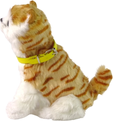 Ce chaton en peluche réaliste, au pelage blanc-roux avec des rayures brunes et un collier jaune amovible, charmera chaque enfant. Une caresse sur la tête et il s’anime – il miaule doucement et bouge adorablement la tête et la queue. Son pelage doux et soyeux en fera le compagnon préféré pour le dodo comme pour les voyages.