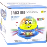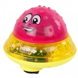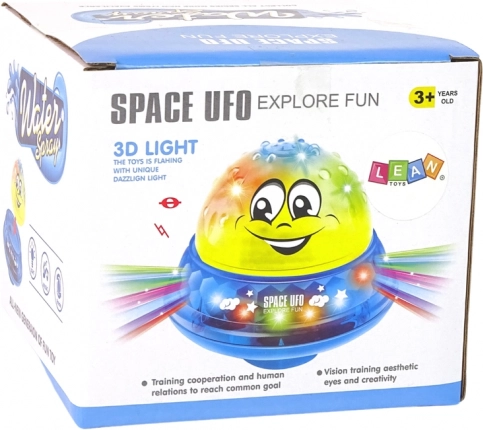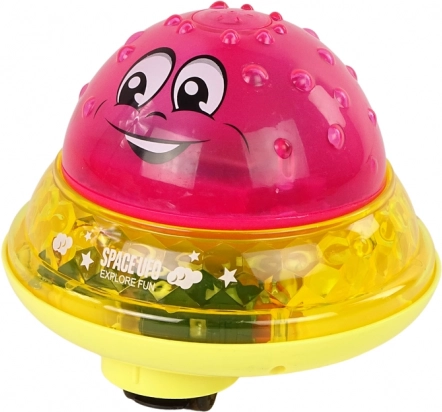 La balle d'eau UFO est un jouet en deux parties qui fonctionne de jour comme de nuit. Elle est de couleur rose avec des ouvertures sur le dessus, d'où l'eau gicle lorsqu'elle est immergée. Après le bain, le jouet peut être déplacé dans la chambre où une petite base en forme de soucoupe volante l'attend. Lorsque la surface de la balle et de la soucoupe se connectent, une musique joyeuse et des diodes colorées s'activent, créant une petite discothèque à la maison.