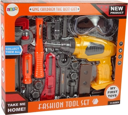 Le set de jeu est présenté dans un emballage orange et noir attrayant, avec des inscriptions telles que « Fashion Tool Set ».