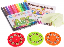 Trois disques de huit images (animaux, véhicules, fruits et légumes) et un set de 12 feutres avec bloc-notes et éponge permettent aux enfants de créer immédiatement, sans achats supplémentaires.