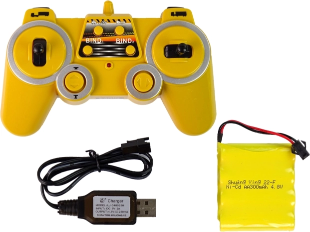 Le véhicule est alimenté par une batterie rechargeable 4,8 V (incluse), tandis que la télécommande nécessite deux piles AA 1,5 V (non incluses). Le véhicule convient aux enfants de plus de 6 ans. L’ensemble est emballé dans une boîte en carton avec fenêtre transparente, idéal comme cadeau.