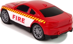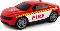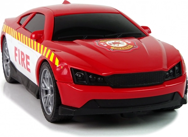 Voiture de pompiers sportive avec marquages FIRE bien visibles et pneus en caoutchouc, file à toute vitesse sur les sols lisses.