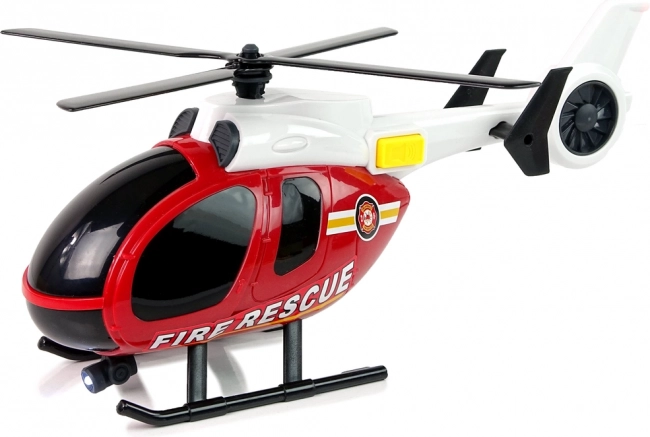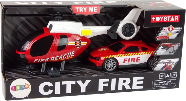 Ce kit de secours CITY FIRE offre aux enfants tout ce dont ils ont besoin pour leurs propres interventions de pompiers. Le grand hélicoptère marqué FIRE RESCUE possède des rotors à rotation manuelle d’une envergure d’environ 20 cm et, via le bouton latéral, déclenche lumières et sons de démarrage et de vol. La voiture de pompiers sportive, avec pneus en caoutchouc et marquages voyants, roule en douceur sur surfaces planes et complète les scénarios d’action.