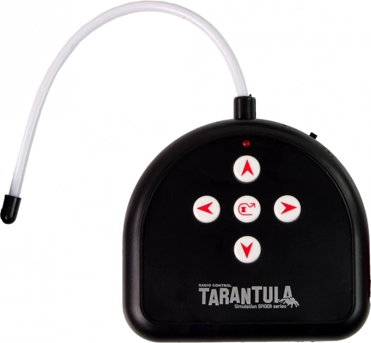 La télécommande noire est équipée de cinq boutons et fonctionne sur une fréquence de 27 Mhz. Elle comprend des boutons pour contrôler la direction des mouvements et un bouton pour une démonstration automatique. L'araignée peut tourner autour de son axe et ses mouvements sont assurés par des roues qui lui permettent une rotation fluide et une manœuvrabilité.