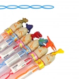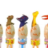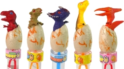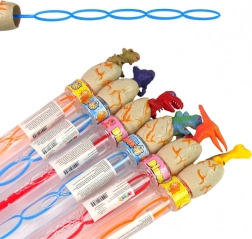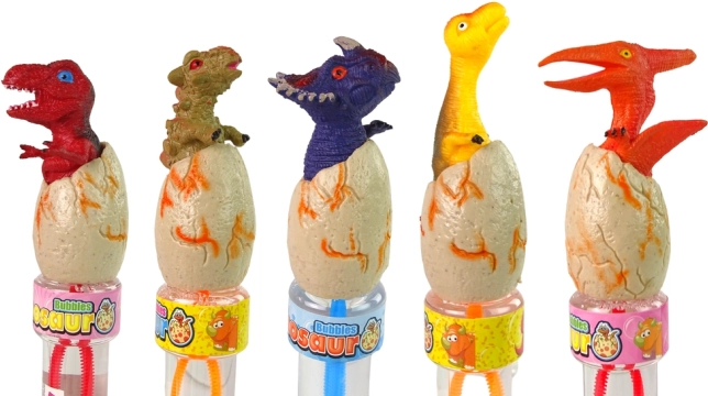 Chaque flacon a une forme allongée avec un couvercle en forme de dinosaures dans un œuf. Sont disponibles 6 modèles (ptérodactyle, T‑Rex, tricératops, stégosaure, brachiosaure, ankylosaure) de différentes couleurs. Le contenu est incolore et certifié selon CE/EN 71 pour une utilisation sûre.