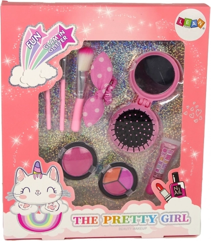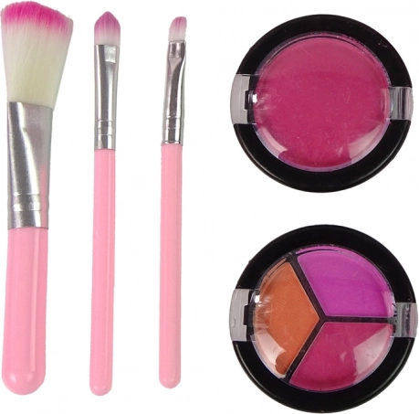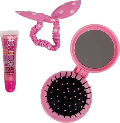 - Contenu du coffret : brosse pliante avec miroir, élastique pour cheveux avec nœud, 3× pinceau, gloss, blush, fards à paupières