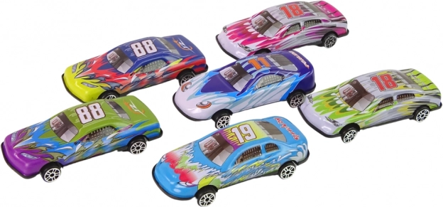 Six voitures de course colorées, chacune avec des motifs et des numéros uniques, conçues pour les jeux de course.