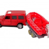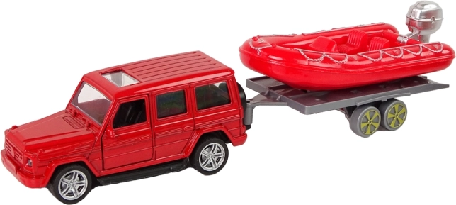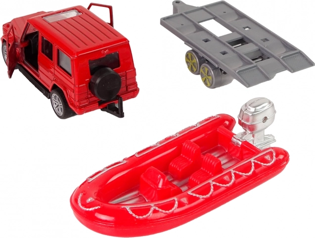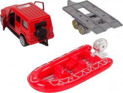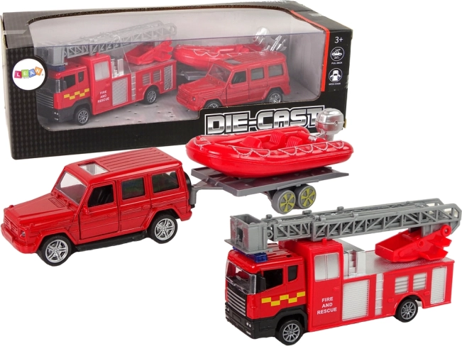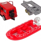 Le bateau pneumatique sur remorque peut être connecté au véhicule choisi selon le type d'intervention. Le set est complété par des cartes pédagogiques présentant différents types de véhicules de pompiers.