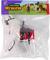 Figurine réaliste d’un cheval blanc avec selle noire et tapis rouge, pour les petits amoureux des écuries et de la ferme. Fabriquée en matériau de qualité, agréable au toucher, avec une longue crinière et une longue queue idéales pour coiffer et tresser. Un excellent complément à une collection de figurines pour jeux créatifs dès 3 ans.