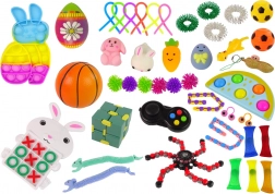 - Pop It (grand lapin, petit œuf), 2 bracelets Pop It, squishy (y compris œuf et balle), 6 serpents en caoutchouc, 2 lapins extensibles, 2 balles à spinner, grand spinner, mini manette de jeu à boutons, 4 tuyaux, 5 pop tubes, cube-puzzle, 4 ressorts, porte-clés « noisette », 6 petites balles avec picots, 2 puzzles de formes, lapin avec jeu de morpion