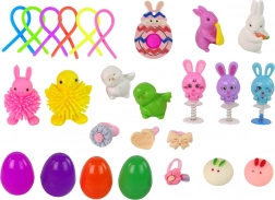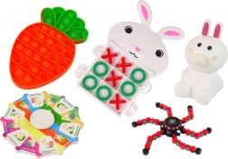 L’ensemble contient au total 24 pièces : un jeu de morpion (tic-tac-toe), une carotte pop it, 4 figurines de lapins, une toupie + une toupie « Happy Easter », 3 jouets sauteurs, 6 serpents en caoutchouc, un lapin anti-stress, 2 squishys lapins, 4 bagues, 2 lapins à presser, un lapin pop it avec excroissance et 4 œufs pliables. Grâce à ses dimensions compactes, le coffret est parfait pour les voyages et la maternelle.