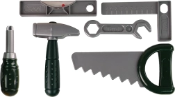 Le set contient tous les outils nécessaires pour petits réparateurs, y compris un marteau, un tournevis et une scie.