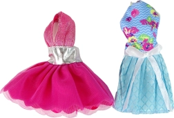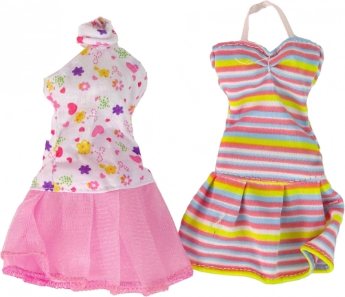 Inclus : 4 robes interchangeables (à rayures, robe de soirée rose à paillettes, bleue à motif floral avec nœud, délicate rose et blanche avec fleurs et cœurs), deux sacs à main, un chapeau et des chaussures de rechange. Le tout est présenté dans un emballage cadeau avec fenêtre, qui séduit au premier regard.