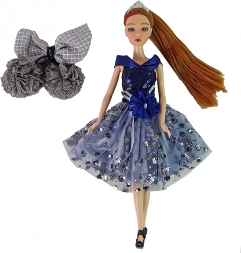 Emily séduit par sa robe bleue brillante ornée de paillettes et sa tiare élégante – idéale pour les défilés de mode et les histoires féeriques.