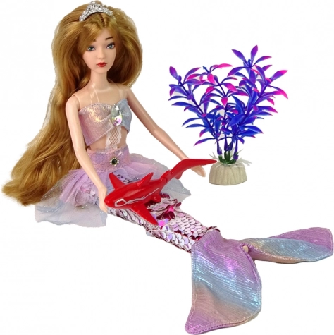 La queue se retire facilement et la poupée peut tenir sur ses petites jambes, offrant deux façons de jouer : en sirène ou en poupée classique. L’emballage comprend un requin décoratif rouge et une plante d’aquarium colorée, qui enrichissent les possibilités d’histoires et de jeux imaginatifs.