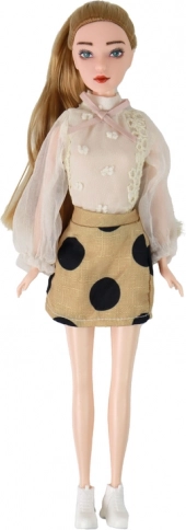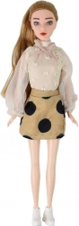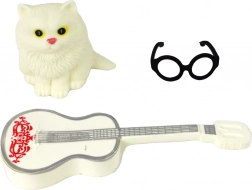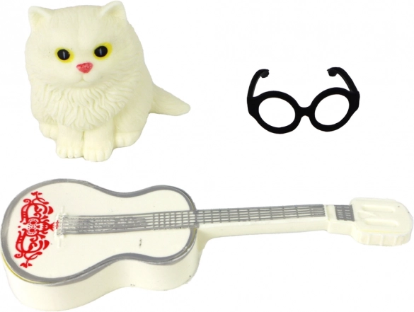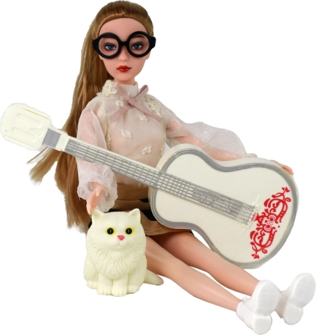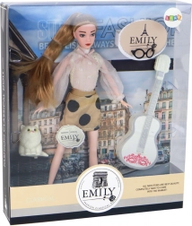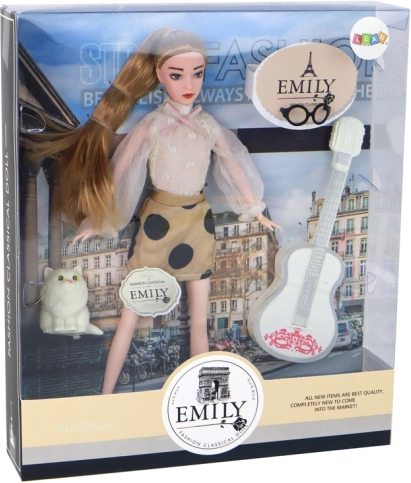 La poupée Emily séduit par son allure élégante : chemisier blanc transparent avec détails, jupe marron à pois noirs et baskets blanches. Ses longs cheveux blonds attachés en queue de cheval sont complétés par des lunettes noires. La guitare blanche avec décoration rose invite au jeu créatif et à inventer ses propres histoires, avec le fidèle chaton à ses côtés.