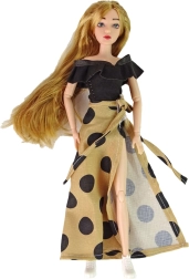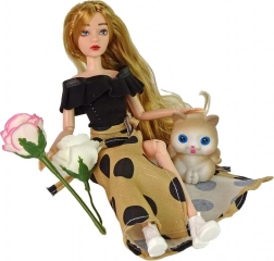 La poupée Emily porte une élégante blouse noire et une longue jupe beige à pois. Elle a de longs cheveux parfaits pour peigner et créer des coiffures, un visage peint de façon réaliste avec des yeux bleus et est entièrement positionnable grâce à ses articulations. Le coffret comprend également un adorable chaton et des roses décoratives qui enrichissent les histoires du quotidien et les jeux de rôle en famille.
