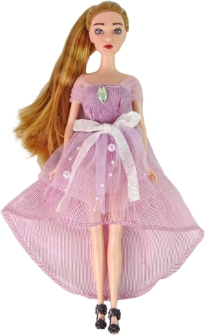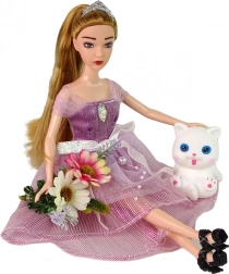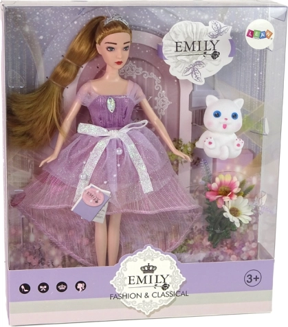 Apportez une touche de magie au jeu de votre enfant avec la poupée Emily. Elle a de longs cheveux blonds attachés en queue de cheval, porte une longue robe rose ornée de perles et de nœuds, un diadème sur la tête et de élégantes chaussures à talons aux pieds. Le set comprend également un chaton blanc aux yeux bleus et des fleurs décoratives.