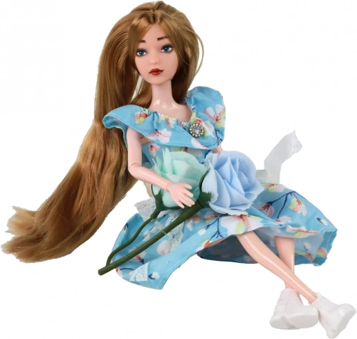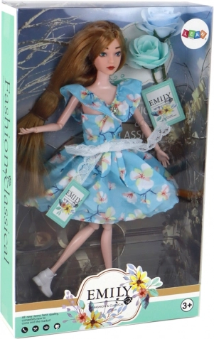 La poupée Emily (30 × 7 × 4 cm) est une compagne idéale pour le jeu quotidien. Ses longs cheveux blond foncé se coiffent et se décorent facilement, permettant aux enfants de créer d’innombrables coiffures. Sa robe bleue à motif floral est ornée d’un petit nœud en dentelle et d’un détail « diamant » au décolleté, qui lui confère une allure élégante.