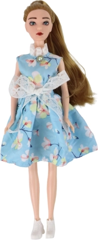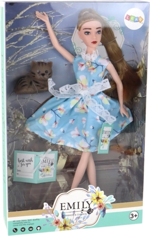 La poupée Emily (30 × 7 × 4 cm) est une compagne délicate pour le jeu créatif. Elle possède de longs cheveux blond foncé faciles à coiffer et à décorer, des yeux verts et un maquillage discret pour un look réaliste. Elle porte une ravissante robe bleue à motif floral avec dentelle, petit nœud et col, rehaussée d’un détail « diamant » au cou, ainsi que des chaussures blanches.