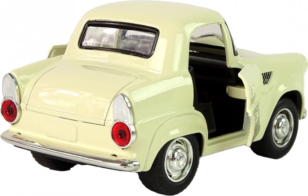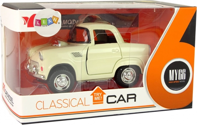 Voiture classique en métal de couleur beige avec des détails noirs et argentés pour un aspect réaliste.