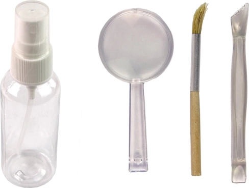 Le kit comprend une bouteille d'eau, un pinceau de précision, une loupe et un outil de fouille, tout ce qu'il faut pour le parfait petit archéologue.